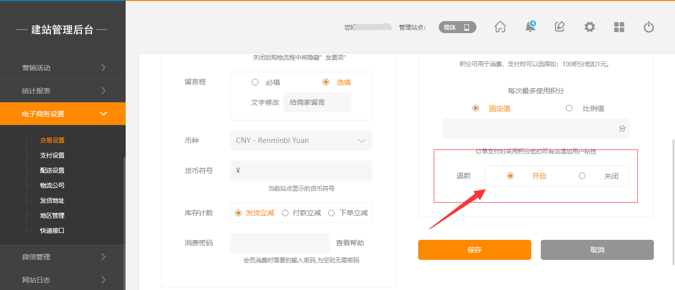在后台,“电子商务设置”-“交易设置”中,有一个退款的操作,当开启该操作时,在前台用户页面可以直接申请退款,后台消息提醒中也会有相应的提示,点击“查看”即可(注:“退款”默认为关闭状态),如图所示: