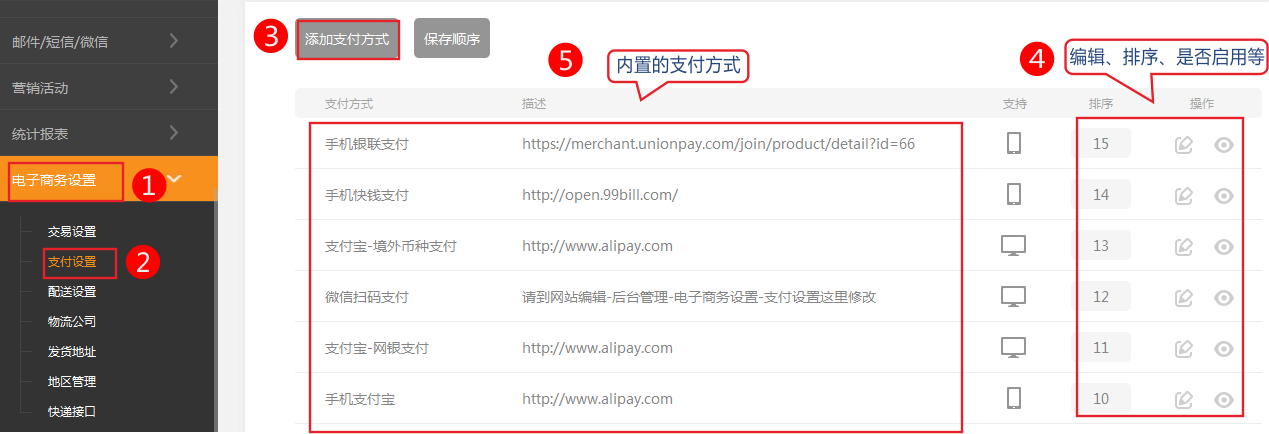 依次点击》电子商务设置-》支付设置,可以看到系统已经内置了一些常用的支付方式,再配置一下帐号就可以使用了。