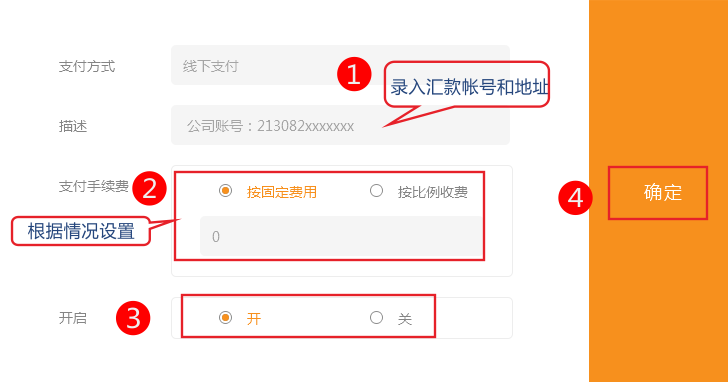 在支付设置中点击添加,进行编辑:将银行帐号及汇款地址放在详细描述中,供顾客选择。顾客付款后再联系站长进行说明。